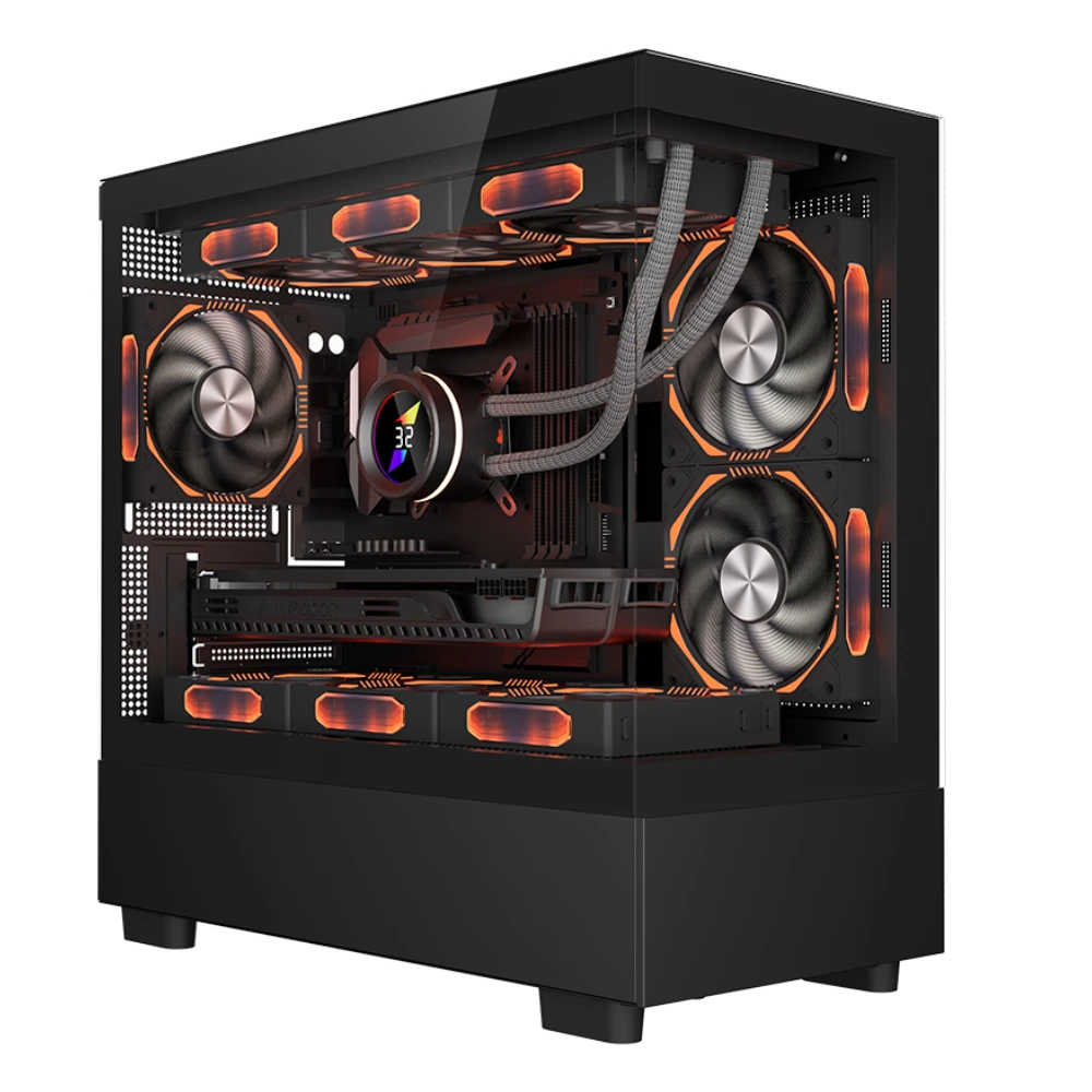 | Alte caracteristici carcasă | Filtre magnetice pentru praf Panou lateral și frontal din sticlă securizată Iluminare ARGB + telecomandă RF 6 x ventilatoare aRGB 1x USB Type-C, 1x USB 3.0, 1x USB 2.0, HD Audio, buton LED |